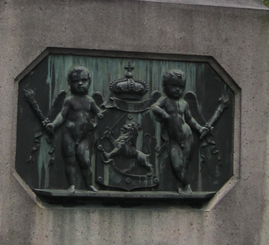En la propia base de granito y antes de la estatua al homenajeado, en la parte delantera del monumento se encuentra una placa rectangular de bronce con esquinas biseladas, en cuyo centro se encuentra el escudo de armas de Finlandia, compuesto por un león coronado portando una espada en su garra derecha, mientras pisa un sable curvo. A ambos lados del escudo, dos ángeles o putti con antorchas en sus manos se apoyan en él. Generalmente se ha interpretado a la pareja dentro del campo de las humanidades al que perteneció el propio Porthan como la educación, o como la iluminación de su propio genio.