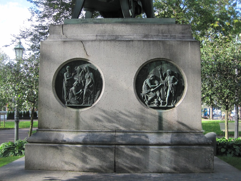 La base se completa con medallones de bronce a ambos lados. A la izquierda se encuentran los retratos de los profesores Johan Jakob Tengström (1787-1858) y Franz Mikael Franzén (1772-1847), ya que ambos promovieron el estudio del folklore finlandés siguiendo los pasos del homenajeado.