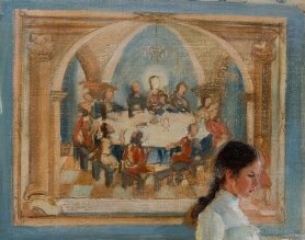 Toda la estancia se complementa con muebles blancos en madera con tapizados y cojines en tonos fríos, junto a una decoración en la línea del estilo del Arts and Crafts inglés a través de la cenefa decorativa que recorre la estancia en su parte superior y con grandes elementos pictóricos en sus muros a través de obras de tipo religioso entre los que destaca por su tamaño la Última Cena, aunque la celebración sea un cumpleaños familiar.