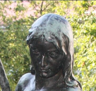 El rostro de perfil clásico pero con facciones gruesas propias de la escuela alemana, se encuentra enmarcado por el cabello mojado, suelto y ondulado como prueba de la alegoría a la que representa. La figura gira su cabeza hacia la izquierda posando la mirada en el suelo, ensimismada en sus pensamientos, algo contrario a la hora de tocar el arpa, ya que los intérpretes suelen mirar las cuerdas que deben pulsar para ejecutar la melodía.