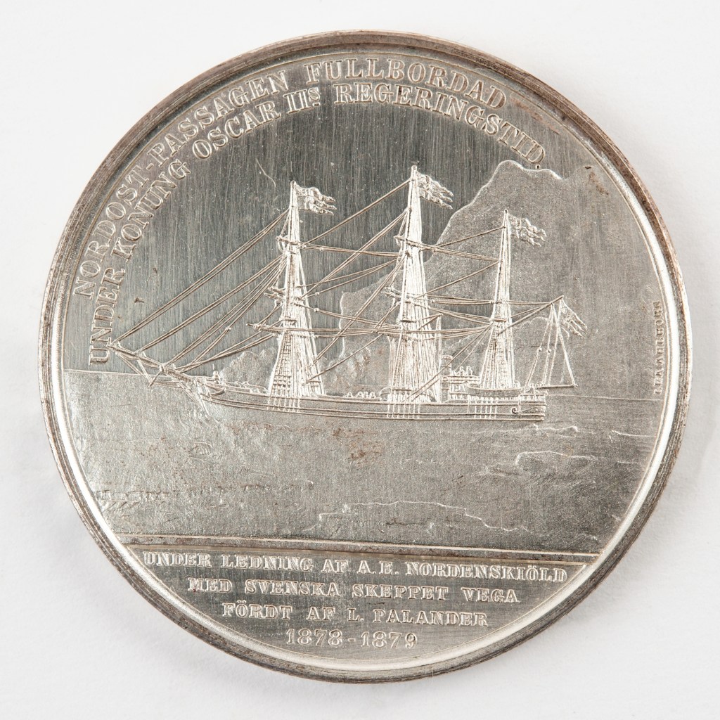 La pieza de esta semana es de pequeño tamaño. Se trata de una “Medalla conmemorativa sobre la expedición Vega (“Minnesmedalj på Vegaexpeditionen”). Realizada en 1880 por Lea Ahlborn (1826, Estocolmo – 1897, Estocolmo), tiene un diámetro de 43 cm y un espesor de 3 mm. Al ser una medalla para celebrar un acontecimiento, existen copias tanto en plata como en bronce qué se encuentran en el Museo Marítimo (Sjöhistoriska museet ) en Estocolmo.