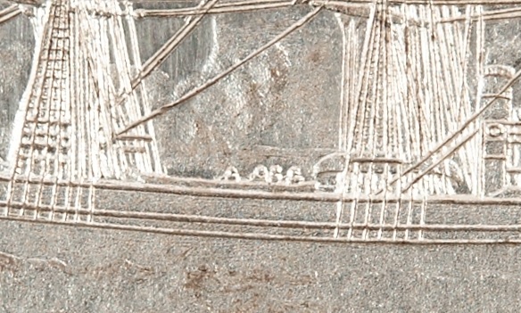 En ambas caras de la pieza se puede ver el detallismo de Lea Ahlborn, dónde graba varias capas en la superficie del metal trabajando desde el alto al bajorrelieve, creando tridimensionalidad en la representación. Además, su minuciosidad es tal en una pieza tan pequeña qué se pueden distinguir desde el grosor de los cabos a varios marineros en la cubierta del barco.