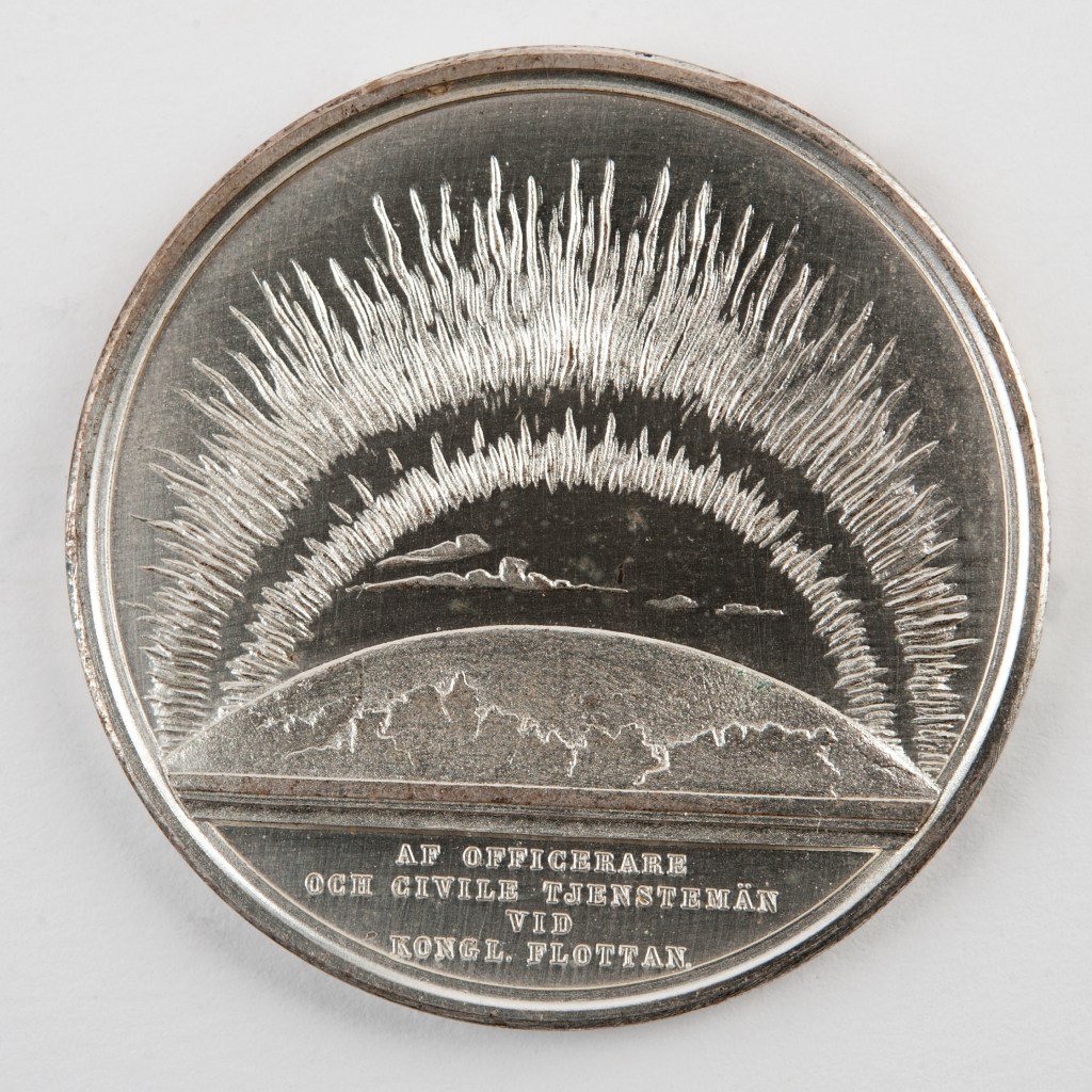 El reverso muestra el hemisferio norte del globo terráqueo, en referencia a la expedición realizada, sobre el qué se recortan entre las nubes las luces de la Aurora Boreal y en su parte más inferior un texto qué dice: “Af officerare och civila tjänstemän vid kongl. Flottan.” (“por funcionarios y funcionarios públicos de la Armada Real”).