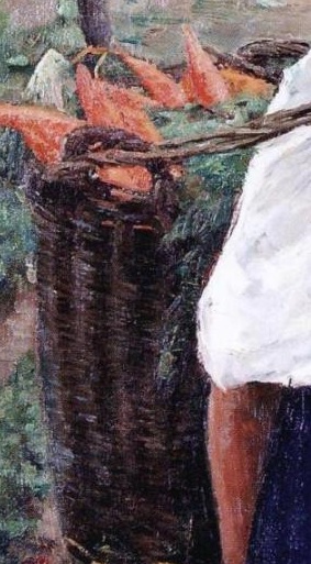 El tema principal es la joven campesina vestida con falda y una blusa blanca sobre la qué se apoyan conformando una diagonal las tiras de una gran cesta de mimbre cargada con zanahorias. Su rostro es redondo con la piel enrojecida por las horas transcurridas al sol, mientras qué su pelo rubio se encuentra recogido en un moño bajo.