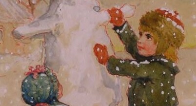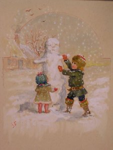 Un ejemplo es ésta acuarela realizada en una fecha desconocida. El motivo se encuentra recortado en el interior de una composición geométrica trazada con una línea roja qué recuerda a un ventanal o una puerta sobre el qué el espectador se asoma. La composición se encuentra equilibrada en su centro con el muñeco de nieve a cuyos lados se encuentran los infantes qué lo andan realizando. Además, la línea del horizonte ayuda a crear un espacio dónde todo el paisaje está cubierto por un manto blanco, con una pequeña franja de cielo despejado y una casa en uno de los lados.