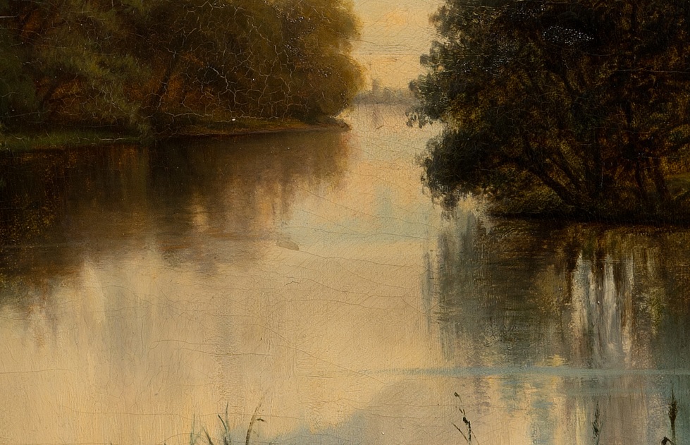 La artista muestra la influencia de la escuela pictórica alemana con un gran nivel de detallismo en los reflejos del agua, dónde son reflejados los robles de ambas orillas y algunas nubes esponjosas. Esto contrasta con las figuras humanas atareadas en sus labores cotidianas, dónde no se distinguen los rasgos de ninguna de ellas debido a las posiciones en las qué se encuentran. La luz del lienzo es la propia de las últimas horas del día, siendo tamizado el fulgor del astro rey mediante las nubes que se encuentran en la parte superior de la obra. Además se crean grandes sombras en los robledales, reflejadas en el agua, gracias a la alta presencia de dichos árboles en el paisaje. La orilla dónde la familia realiza sus tareas se encuentra algo más iluminada, quizás planteada como una diagonal lumínica realizada a propósito por la artista.