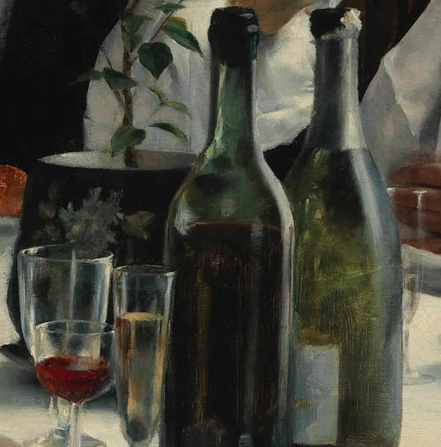 En la paleta empleada por el pintor predominan los tonos luminosos a través del empleo de blancos y las distintas gamas de verdes presentes en las plantas, en las botellas y en la pared aunque también se encuentran ocres y rojos en el vino, las frutas y las flores. Todo ello contrasta con el negro de la indumentaria de los invitados y las zonas más oscurecidas del salón qué se encuentran a la izquierda del lienzo, todo ello ejecutado a través de una pincelada ligera con poco empaste.