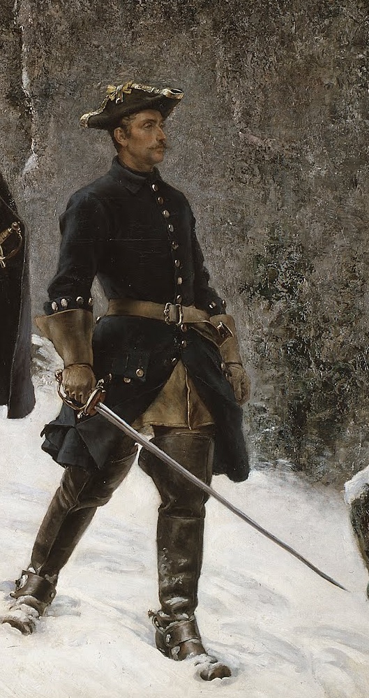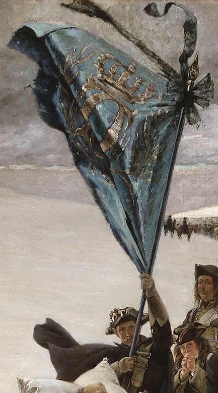 El cortejo es liderado por el Capitán Lugarteniente (Kaptenlöjtnant) con la espada desenvainada y tocado por un sombrero triangular de fieltro, motivo que sería copiado en uno de sus cuadernos de bocetos por la artista finlandesa Helene Schjerfbeck (1862-1946) cuando contaba con diecisiete años tomando la versión del Ateneum, mientras que se cierra con el cuerpo de infantería con un soldado portando la bandera con el emblema del monarca conformado por el número doce en números romanos entre dos trompas y rematada con la corona sueca.