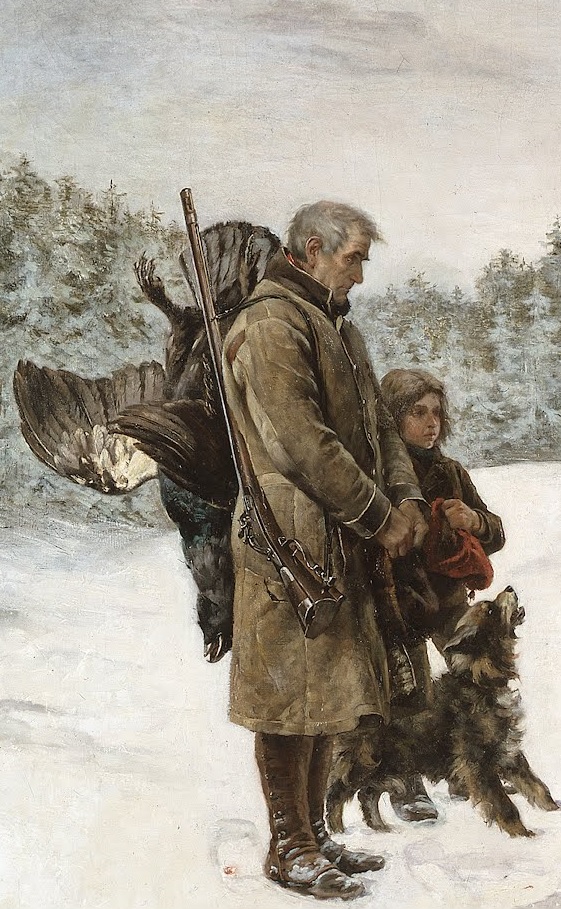 El desfile es contemplado en el lado izquierdo de la obra por una pareja de cazadores junto a un perro, ambos con los sombreros entre sus manos en respeto al fallecido. El hombre adulto, vestido de colores pardos y con calva incipiente porta a su espalda una escopeta de caza y un ave de gran tamaño, mientras que el modelo empleado para el niño fue Carola, la propia hija de Gustaf Cederström.