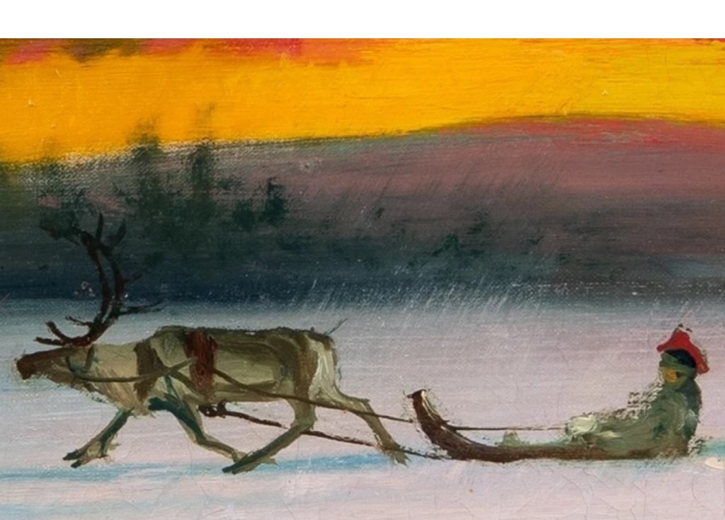 La obra de esta semana se titula “Un lapón y la Noche Polar” (“Lappilainen ja napayö”). Se trata de un lienzo de pequeño tamaño ejecutado en 1905 por el pintor finlandés Juho Kyyhkynen (1875, Kemijärvi – 1909, Rovaniemi), el primer artista que plasmaría el paisaje de Laponia. Con unas medidas de 38 x 55 cm, se encuentra actualmente a la venta.