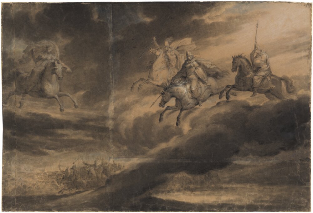 La obra de esta semana es un gran óleo sobre lienzo con tema mitológico. Se titula “Las Valkirias cabalgando a la batalla” (“Valkyrior ridande till strid”), realizado hacia 1818 por el pintor sueco Johan Gustaf Sandberg (1782, Estocolmo – 1854, Estocolmo). Con unas medidas de 140 x 201 cm se encuentra en el Museo Nacional (Nationalmuseum) en Estocolmo.