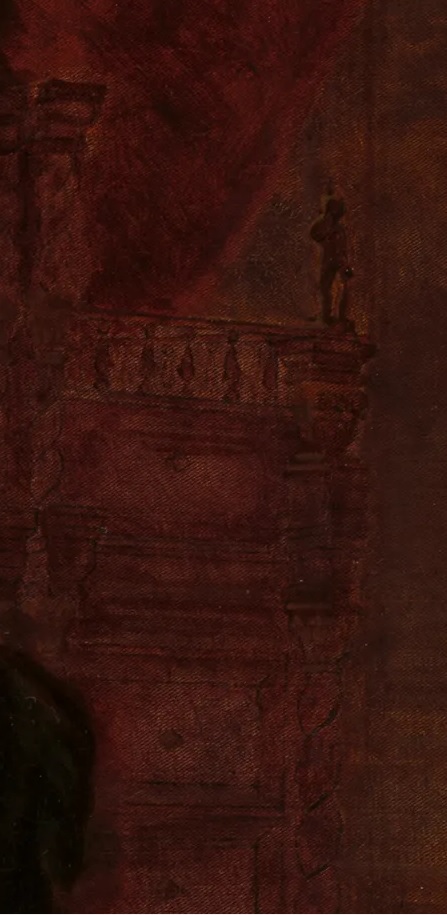 En la paleta predomina el color rojo en los cortinajes, vinculado a la estética del poder, y los ocres y dorados, especialmente en la contraventana dorada, los muebles del fondo y el ribete del tapete. Ésto contrasta con el blanco del vestido real y el reposapiés y con la indumentaria oscura de su canciller.