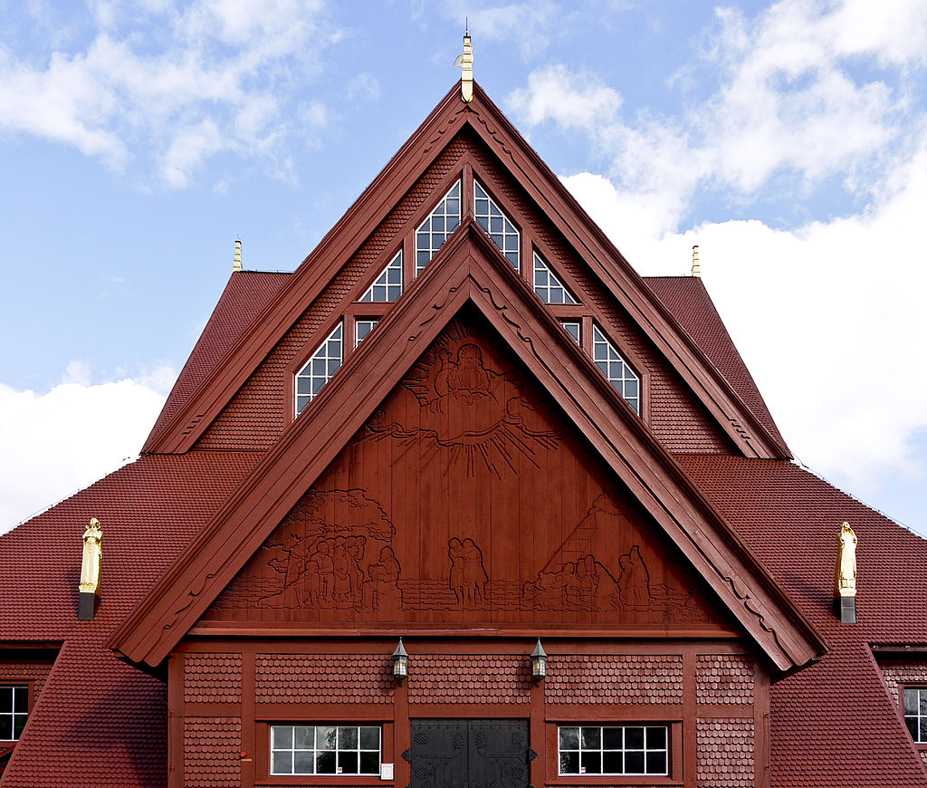 Al exterior la iglesia reposa sobre un zócalo de mampostería de piedra natural, inspirada también en las cabañas del pueblo sami, llamadas lávvu. La estructura se compone de dos pisos, el primero con dos frontones en los lados este y oeste, y el segundo lo conforman cuatro tejados a dos aguas que convergen en su centro en una torre en forma de aguja. El frontal del lado oeste está tallado por Christian Eriksson (1858-1935) representando en su vértice superior a Dios Padre en las nubes mientras que los otros muestran a una comunidad sami (derecha), a dos personas sosteniéndose mutuamente (centro) y en la esquina izquierda un predicador bajo un árbol frente a una multitud. Bajo ella hay una puerta doble de hierro diseñada por el pintor Ossian Elgström (1883-1950), plasmando gallos o peces en ella.