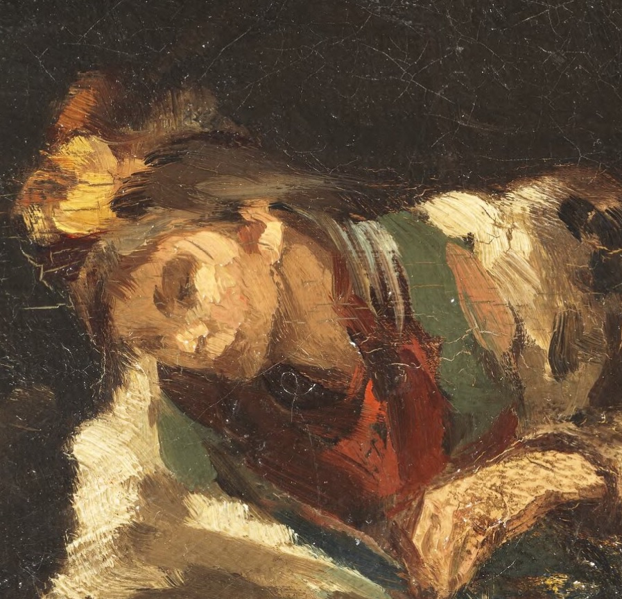 En fecha desconocida en la década de 1870 realizaría la obra de ésta semana plasmando a una joven mientras acuna a su hijo en el interior de un espacio lleno de objetos, entre ellos un trineo, pudiendo tratarse de un almacén o de una tienda. La protagonista se encuentra semirecostada en un suelo cubierto con pieles, manteniendo la posición con el sostén de su mano derecha mientras que con la contraria y la ayuda de su cadera mece a su recién nacido en una cuna de madera, no fácilmente identificable.
